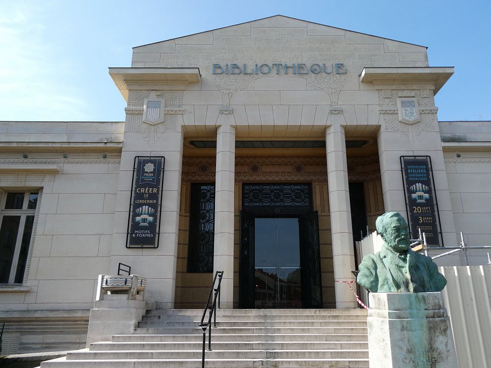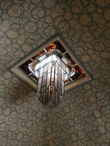Puis nous voilà au pied de la Cathédrale. Nous la contournons pour entrer dans la Bibliothèque Art Déco. Elle a été construite par la fondation Carnegie. La salle dans laquelle nous entrons a des murs en marbre et une très jolie lanterne créée par Jacques Simon, un maître verrier dont les œuvres sont omniprésentes à Reims.