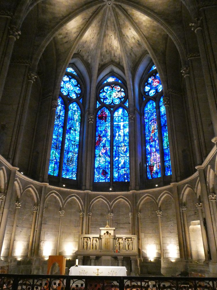 Là aussi les vitraux sont splendides et au dessus du chœur, l’œil est inexorablement attiré par les vitraux de Marc Chagall.